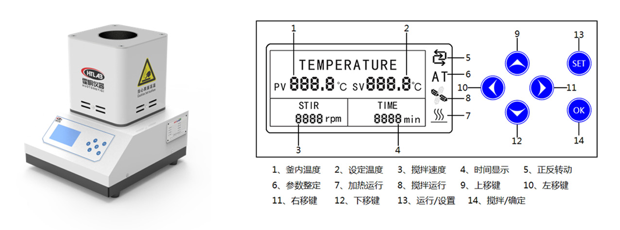 Functional features:Display external temperature, kettle temperature, rotating speed and reaction time; Set the target temperature, upper limit of external temperature, mixing speed, reaction time and alarm temperature difference; Overtemperature automatic power-off protection.